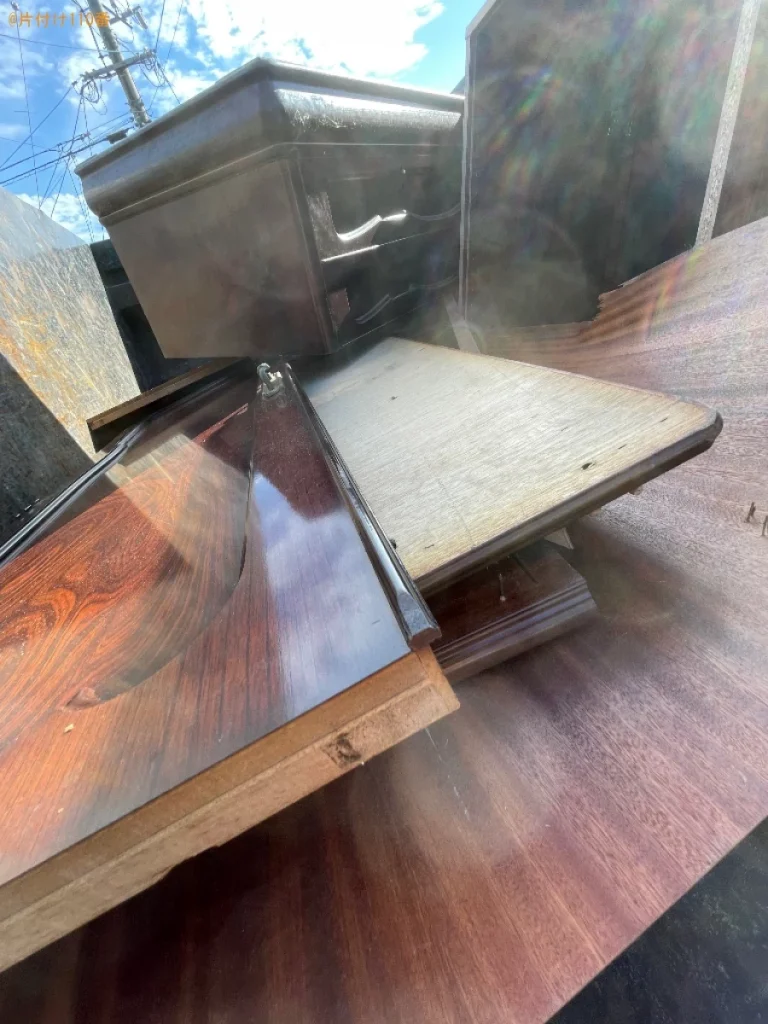 | 担当のコメント | 婚礼タンスの処理にお困りのお客様からご相談いただきました。指定日に回収可能なことがご依頼の決め手になったようです。片付け110番では、二階の窓からの搬出や階段での運び出しも行わせていただきます。不用品がございましたらまたいつでもご相談ください。 |