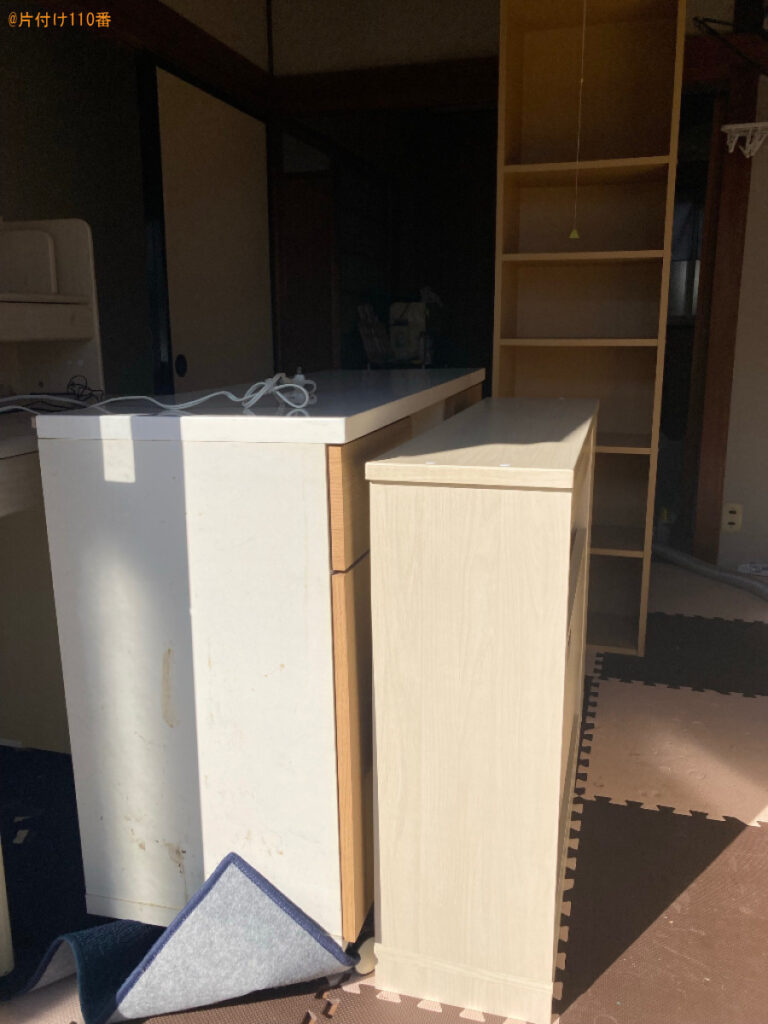 担当のコメント 学習机、サイドボード、棚等の処理にお困りのお客様からご相談いただきました。指定日に回収可能なことがご依頼の決め手になったようです。片付け110番では、お客様のご都合に合わせてお伺いさせていただきます。不用品がございましたらまたいつでもご相談ください。